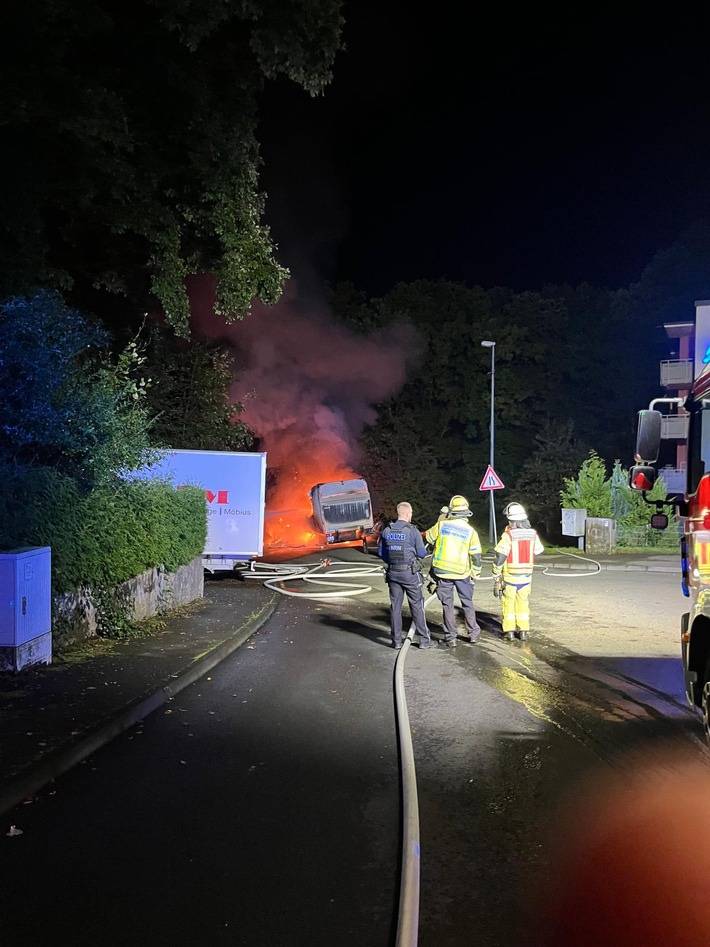 Um 3:18 Uhr wurde die Feuerwehr Remscheid zu einem brennenden LKW in die Rosenhügeler Straße alarmiert. Bei Eintreffen der Einsatzkräfte stand ein, am Fahrbahnrand abgestellter, LKW im Vollbrand. Es wurde umgehend eine Brandbekämpfung mit zwei Hohlstrahlrohren und einem Schaumrohr eingeleitet. Durch das Brandereignis kam es zu einem Austritt von Betriebsstoffen aus dem LKW, welche sich in das Kanalsystem ausbreiteten. In Absprache mit dem Umweltamt der Stadt Remscheid und den Technischen Betrieben Remscheid wurden Ölsperren in einem nahegelegenen Regenrückhaltebecken eingebracht. Es wurde eine Spezialfirma angefordert, um die Betriebsstoffe aus dem Regenrückhaltebecken zu entfernen und die Fahrbahn an der Einsatzstelle zu reinigen. Bis zum Abschluss der Maßnahmen bleibt die Rosenhügeler Straße, ab der Einmündung Feilenhauerweg, in beide Richtungen gesperrt. Während der Einsatzmaßnahmen wurde die Hauptfeuerwache durch die Löscheinheit Lennep besetzt.