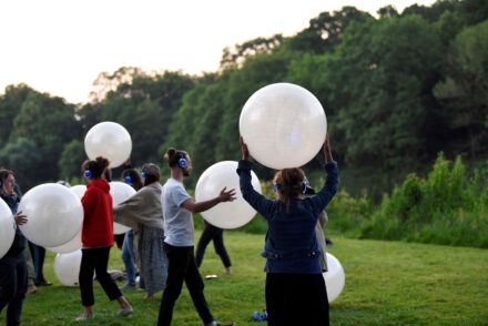 Für die Passanten im Tabakquartier mag es ein etwas verstörendes Bild gewesen sein. Da sitzt eine Gruppe von Menschen mit Kopfhörern auf weißen Sitzbällen auf einer Wiese und bewegen sich leicht auf und ab. Bis sie, wie auf ein Kommando hin, aufstehen und mit den Bällen umhergehen. Was Passanten sahen war allerdings tatsächlich nur ein Teil der Open-Air-Vorstellung der ANTZ! Audioperformance. Die Produktion wurde in den vergangenen Jahren bereits bei Festivals von Flensburg bis Tirol aufgeführt – und jetzt eben auch im Tabakquartier.