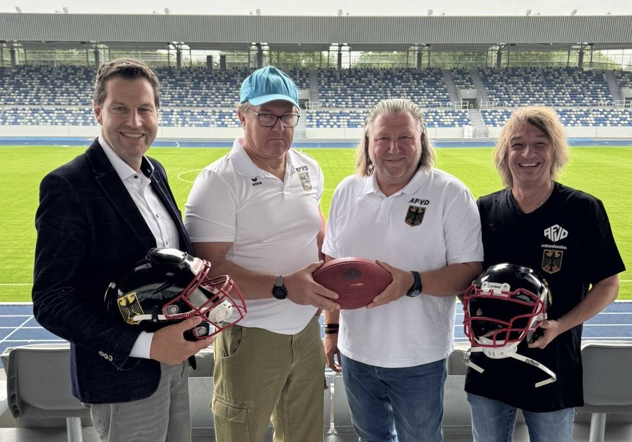 v. l. n. r. Thomas Eiskirch, Oberbürgermeister von Bochum; Andreas Kegelmann, Vize-Präsident des American Football Verbands Deutschland; Heiko Kurzawa, Sportdirektor der American Football Herren-Nationalmannschaft und Michael Wurst, Sänger und Stadionsprecher