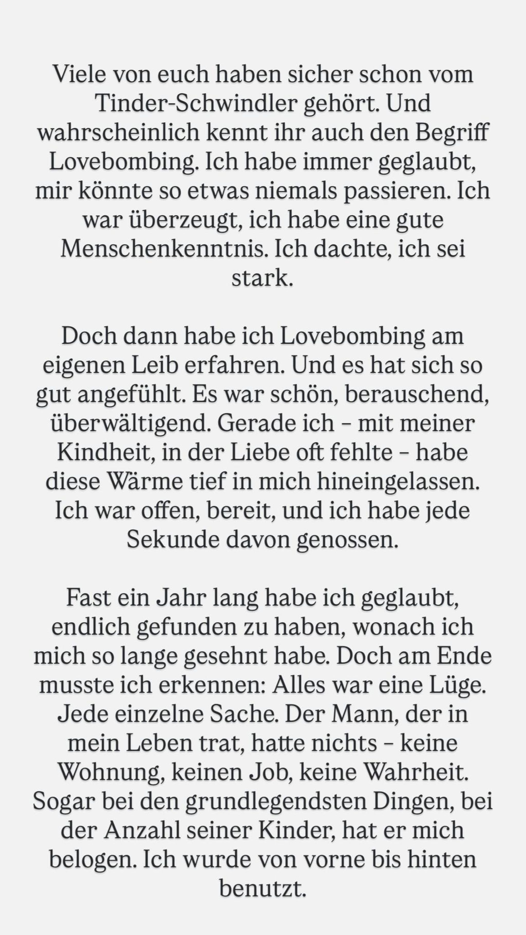 „Fast ein Jahr habe ich geglaubt, endlich das gefunden zu haben, wonach ich mich so lange gesehnt habe. Doch am Ende musste ich erkennen: Alles war eine Lüge“, führt die 35-Jährige weiter aus und ergänzt: „Der Mann, der in mein Leben trat, hatte nichts – keine Wohnung, keinen Job, keine Wahrheit.“ Selbst bei den grundlegendsten Dingen, wie der Anzahl seiner Kinder, sei er nicht ehrlich gewesen.