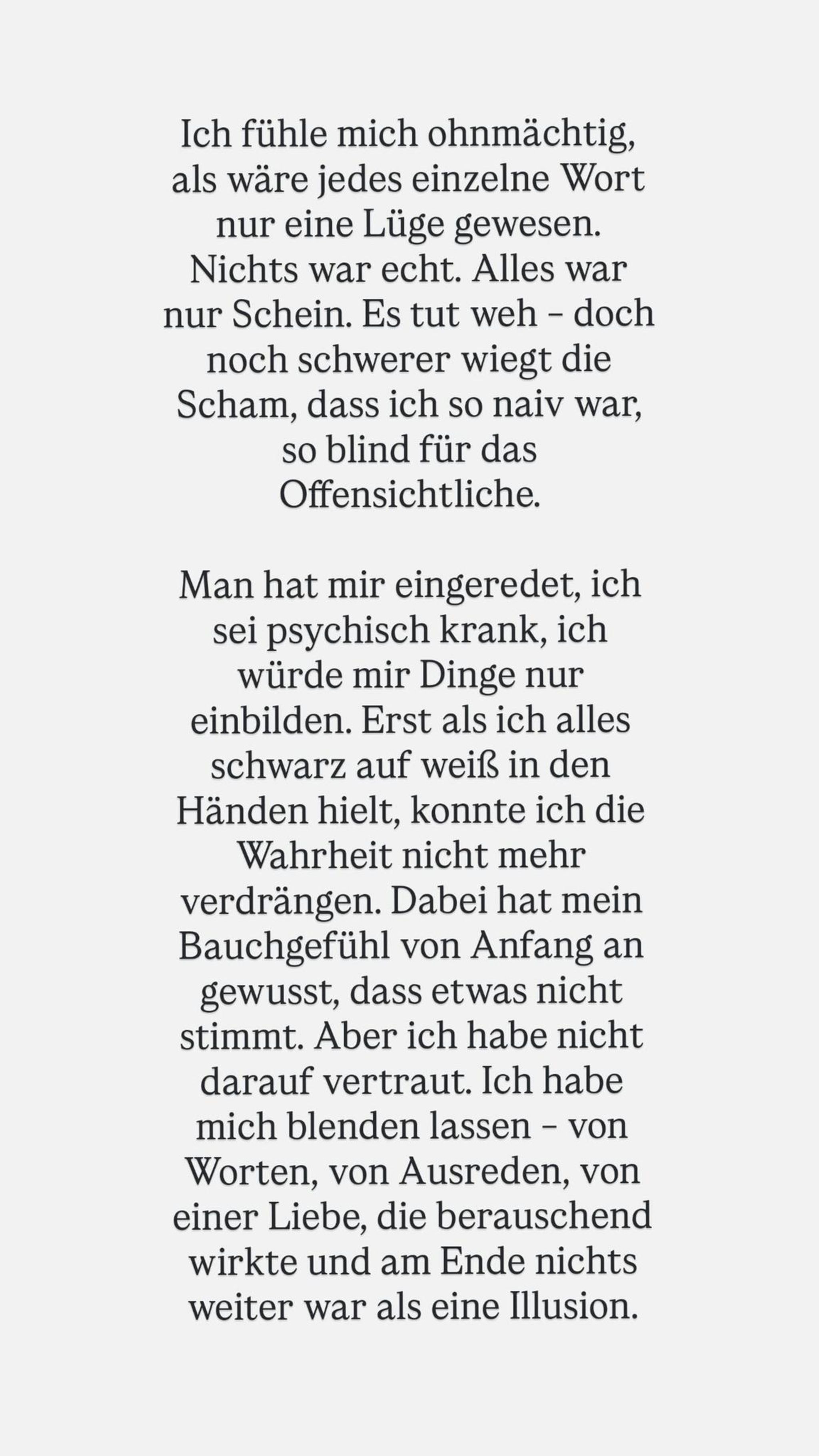 „ich fühle mich ohnmächtig. […] Nichts war echt. Alles war Schein. Es tut weh – doch noch schwerer wiegt die Scham, dass […] ich so blind war für das Offensichtliche“, merkt Sara Kulka an und fügt hinzu: „Man hat mir eingeredet, ich sei psychisch krank, ich würde mir Dinge nur einbilden.“