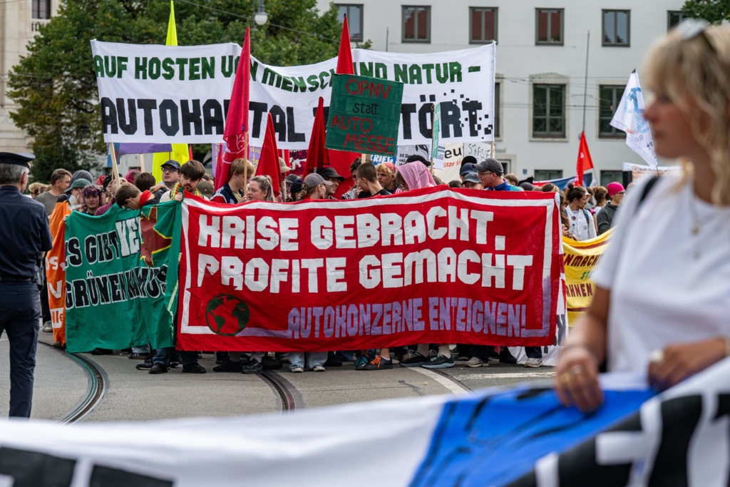 IAA Mobility – Demonstration – „Krise gebracht, Profite gemacht“ steht unter anderem auf den Bannern der Aktivistinnen und Aktivisten. – Foto: Armin Weigel/dpa