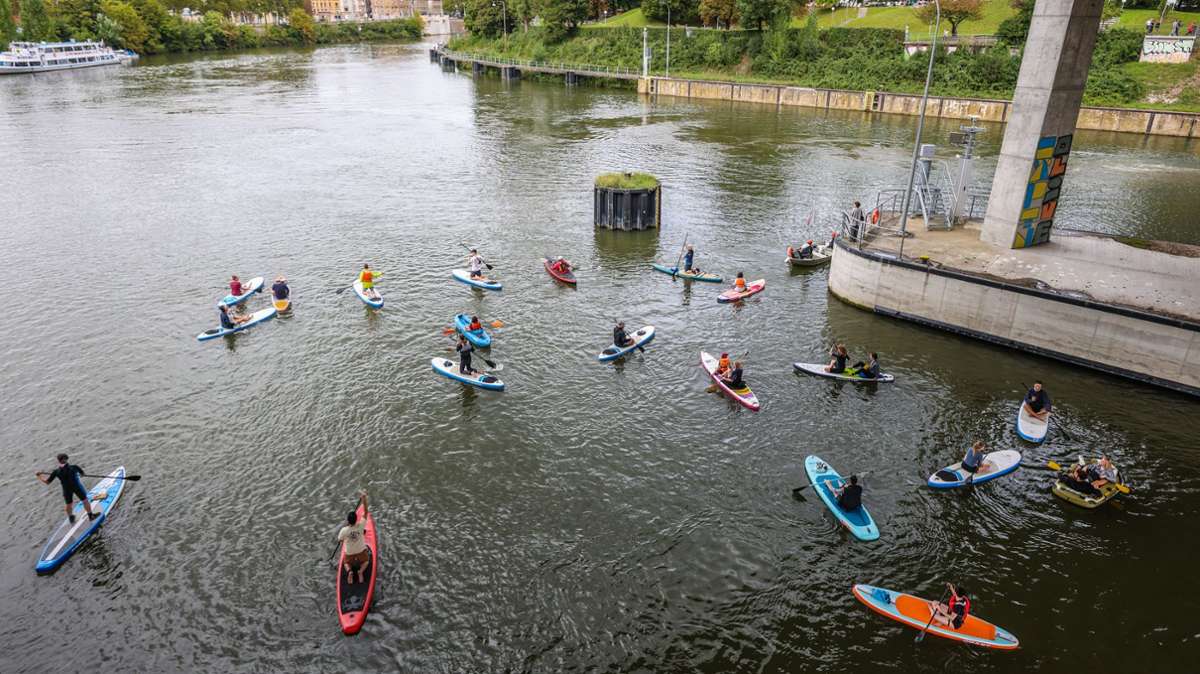 „Wir wollen baden“, steht in roter Schrift auf einer der Flaggen am Ufer, an denen die Teilnehmer am Sonntagmittag vorbei paddeln. Oben auf der Eisenbahnbrücke fahren alle paar Minuten S-Bahnen sowie Regional-und Fernzüge vorbei, am gegenüberliegenden Ufer verläuft die viel befahrene B10, vom Wasserkraftwerk Cannstatt ist das Rauschen des Wassers zu hören.