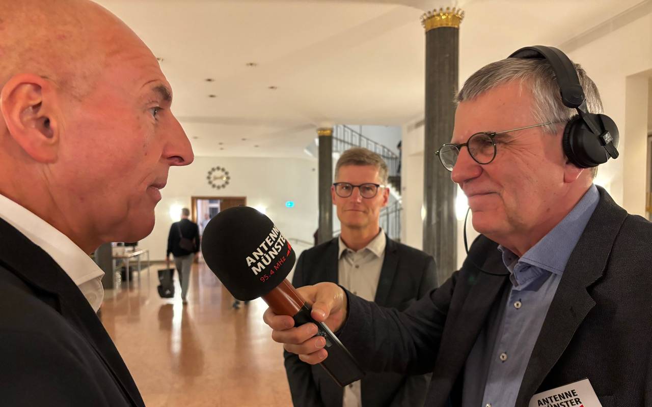 ANTENNE MÜNSTER-Chefreporter Matthias Menne (r.) am Wahlabend (14.09.) im Gespräch mit den OB-Kandidaten Georg Lunemann, CDU (l.) und Tilman Fuchs, Grüne (M.)© ANTENNE MÜNSTER