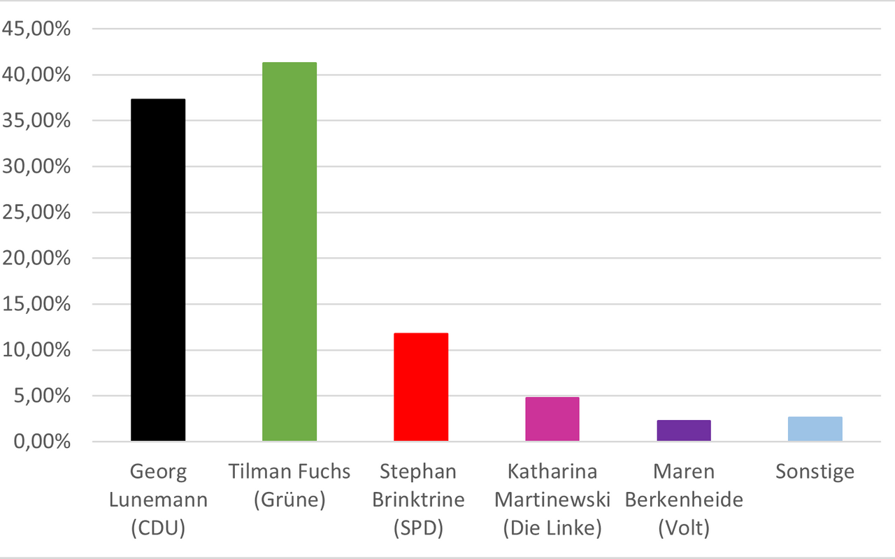 Im ersten Wahlgang hat Tilman Fuchs rund 41% der Stimmen geholt und Georg Lunemann 37%. Das bedeutet: Keiner hat die absolute Mehrheit geschafft.