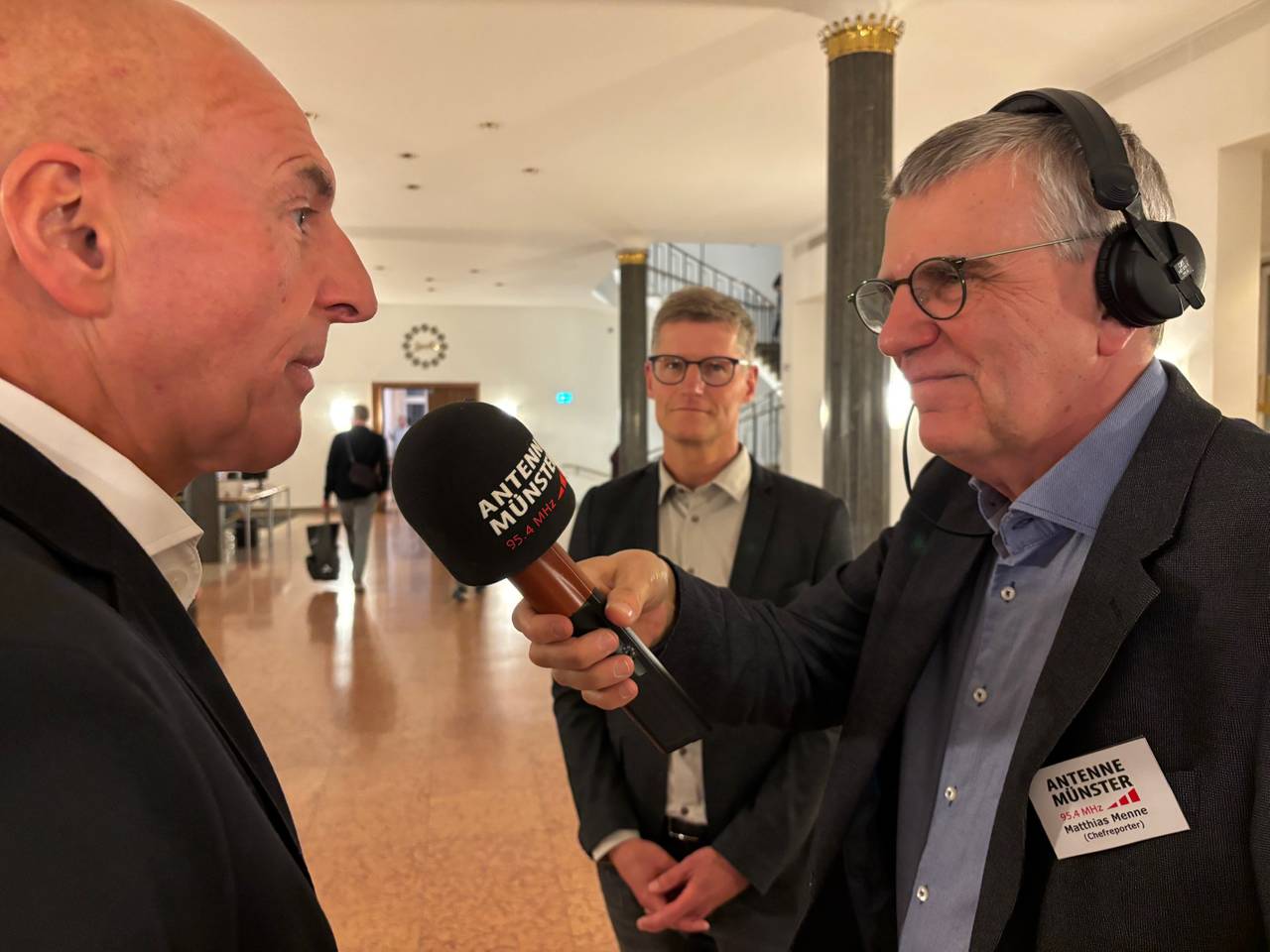 ANTENNE MÜNSTER-Chefreporter Matthias Menne (r.) am Wahlabend (14.09.) im Gespräch mit den OB-Kandidaten Georg Lunemann, CDU (l.) und Tilman Fuchs, Grüne (M.)