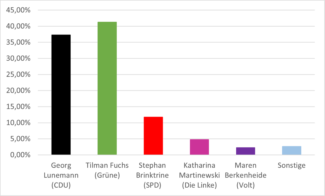 Im ersten Wahlgang hat Tilman Fuchs rund 41% der Stimmen geholt und Georg Lunemann 37%. Das bedeutet: Keiner hat die absolute Mehrheit geschafft.