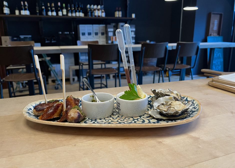 Kulinarische (gelungene) Spielchen in der Weinbar „Schlafendes Auge“ neben dem Eigelstein in Düsseldorf: Irische Auster mit niederrheinischer Bratwurst. Foto: Tonight / M. Tempels