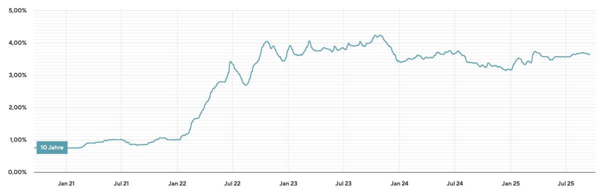 Als Friedrich Merz zusammen mit der hocherfreuten SPD im März 2025 sein „Sondervermögen“ verkündete, lagen die Renditen für Bundesanleihen noch bei 2,40 %. Seitdem ist die Tendenz aufwärts gerichtet. Wichtig: Auch die Bundesländer dürfen sich wieder neu verschulden, und der Bund genehmigt für die Aufrüstung de facto eine unbegrenzte Neuverschuldung. Alles zusammen bedeutet für die Bauzinsen: Vorsicht, Anschnallen! Denn an einem freien Markt bedeutet deutlich mehr Nachfrage nach einem Produkt steigende Preise!