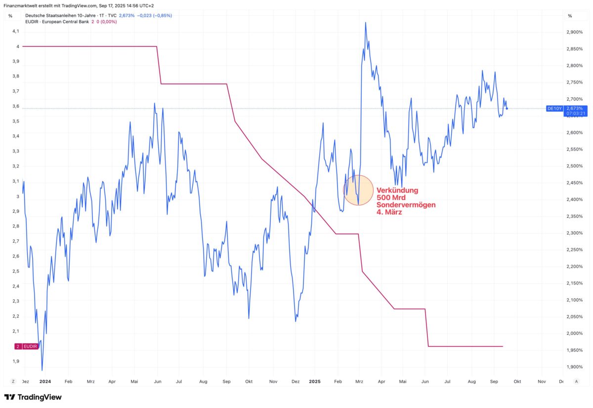 Man muss bedenken: Die EZB hat ihren Leitzins von Sommer 2024 bis Sommer 2025 halbiert von 4,0 % auf 2,0 %. Das ist ein verdammt großer Abwärtsschritt in so kurzer Zeit. Und dennoch machen die Bauzinsen diese Abwärtsbewegung kaum mit. Denn der freie Anleihemarkt drückt dagegen! In der folgenden Grafik sehen wir die halbierten EZB-Zinsen als rote Linie. Gleichzeitig sehen wir als blaue Linie die zehnjährigen deutschen Anleiherenditen, die sich seit Ende 2024 im Aufwärtstrend befinden von 2,04 % auf aktuell 2,67 %. Warum das für die Bauzinsen so wichtig ist? Die Bundesanleihen sind quasi der Referenzmarkt für die Refinanzierung der Banken, die Baudarlehen vergeben. Steigen die Renditen für Bundesanleihen, steigen mit Verzögerung auf die Bauzinsen.
