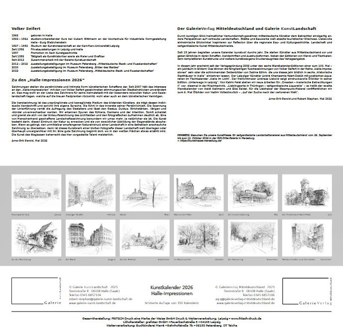 Der Kunstkalender „Halle-Impressionen“ von Volker Seifert, der seit vielen Jahren im GalerieVerlag Mitteldeutschland (Sternstraße 8) erscheint, ist längst ein fester und gefragter Bestandteil in der regionalen Kalenderlandschaft geworden. Die 2026er-Ausgabe versammelt wieder zwölf wunderbare Motive der Saalestadt als filigrane Tuschzeichnungen des halleschen Malers, Grafikers und Kunsthistorikers.
