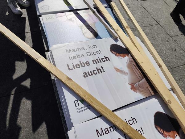 Auf den Schildern der Abtreibungsgegner sind Sprüche wie „Mama, ich liebe Dich! Liebe mich auch!“ neben dem Bild einer schwangeren Frau zu lesen.