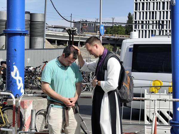 Die Veranstaltung ist stark religiös geprägt: Ein Geistlicher segnet einen Teilnehmer.