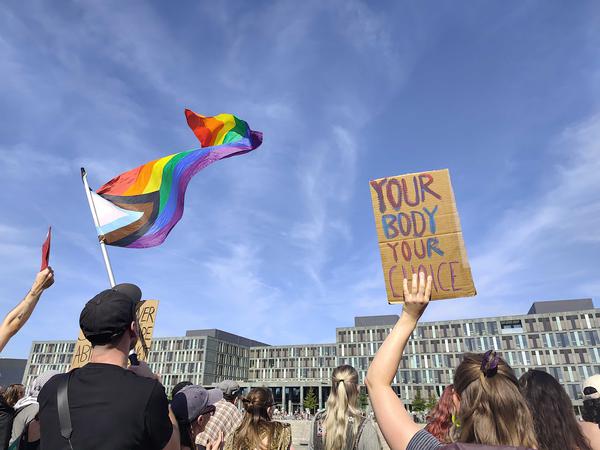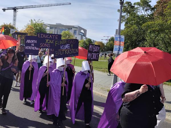 Die große Gruppe von Gegendemonstranten setzt sich etwa zur selben Zeit vor dem Paul-Löbe-Haus in Bewegung. „Sexuelle Selbstbestimmung ist ein Menschenrecht“ steht auf dem Front-Transparent und: „Leben und lieben ohne Bevormundung“.