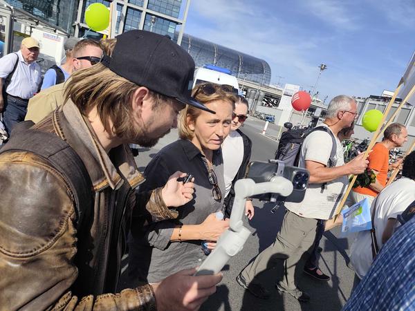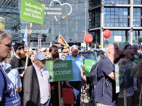 Mehrere Rednerinnen und Redner sprechen beim „Marsch für das Leben“ vor dem Berliner Hauptbahnhof.