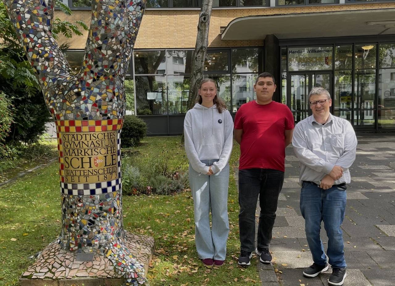 Ella Wellen, Berke Bektas mit Jahrgangsstufenleiter der Q2 Oliver Kröger vor dem Märkischen Gymnasium Wattenscheid.