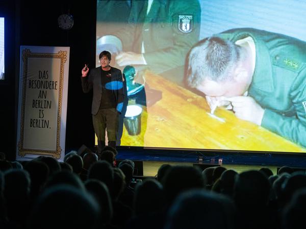 Tagesspiegel-Herausgeber und Checkpoint-Erfinder Lorenz Maroldt gab den Einheizer. Rasant moderierte er einer Bilder-Show mit Schnappschüssen von Lesern, die die Eigenheiten und Skurrilitäten der Hauptstadt zeigen: den täglichen Verkehrsschilder-Wahnsinn, die absurdesten Anzeigen des Nahverkehrs, die verrücktesten Werbeaufsteller.