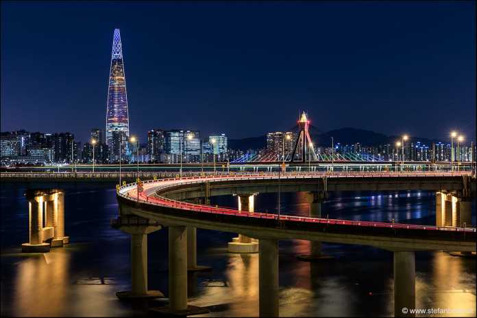 Dieses Nachtbild fängt die urbane Eleganz Seouls ein. Im Zentrum erhebt sich der markant illuminierte Lotte World Tower, flankiert von einer dichten Skyline moderner Hochhäuser. Die geschwungene Straßenführung im Vordergrund lenkt den Blick durch lange Lichtspuren in Richtung Stadt. Auf der rechten Seite setzt die farbig angestrahlte Brückenkonstruktion einen visuellen Akzent. Die Spiegelungen im Han-Fluss verstärken die Tiefe der Komposition und verleihen der Szene zusätzliche Dynamik. Insgesamt eine technisch präzise Aufnahme mit starker Bilddramaturgie durch architektonische Akzente.