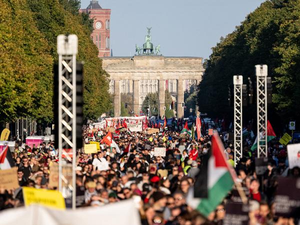 Zehntausende Menschen protestieren am Samstag in Berlin gegen das Leid der Palästinenser. Gegen 18 Uhr hat an der Siegessäule die große Kundgebung begonnen. Organisiert hat sie Bündnis aus 50 Verbänden und Einzelpersonen. Dazu zählen die Menschenrechtsorganisationen Amnesty International, die Palästinensische Gemeinschaft Deutschland, aber auch umstrittene Gruppen wie „Eye 4 Palestine“. Eine Zubringer-Demo der Partei Die Linke war am Nachmittag durch Mitte gezogen.