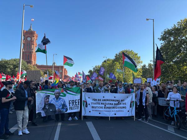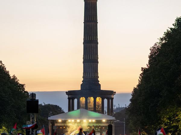 Bei der Kundgebung am Großen Stern gibt es weitere Redebeiträge. „Wir alle sind heute hier, weil wir das Ende einer Beteiligung unserer Bundesregierung am Tod von über 60.000 Palästinensern fordern, darunter 18.000 Kinder“, sagt eine der Moderatorinnen. „Und nein, auch die Verbrechen der Hamas und die anhaltende Geiselname lehnen wir ab. Ein Verbrechen kann niemals ein anderes rechtfertigen.“ Geplant sind zudem Auftritte von Musikern wie der Berliner Band K.I.Z. sowie von den Rapper Ebow und Pashanim.