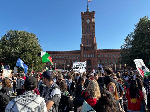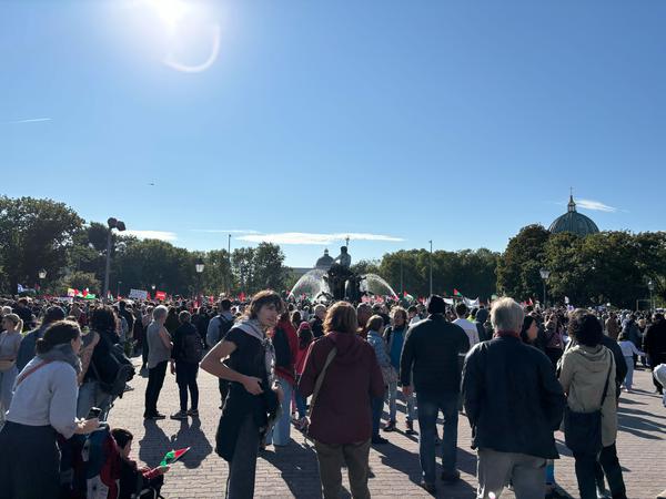 Es gibt weiter starken Zustrom zum Startpunkt der Demonstration am Neptunbrunnen. Mittlerweile haben sich dort mehrere tausend Menschen zur Auftaktkundgebung versammelt. Eine Rednerin fordert von der Bundesregierung, „jegliche militärische Zusammenarbeit mit Israel“ zu beenden. Sie fordert ein Ende der „Besetzung“ Gazas, des „Genozids an den Palästinensern“ und eine „Freilassung aller palästinensischen Geiseln in israelischen Gefängnissen, die größtenteils gekidnappt wurden“. Über die Geiseln der Hamas sagt sie nichts.