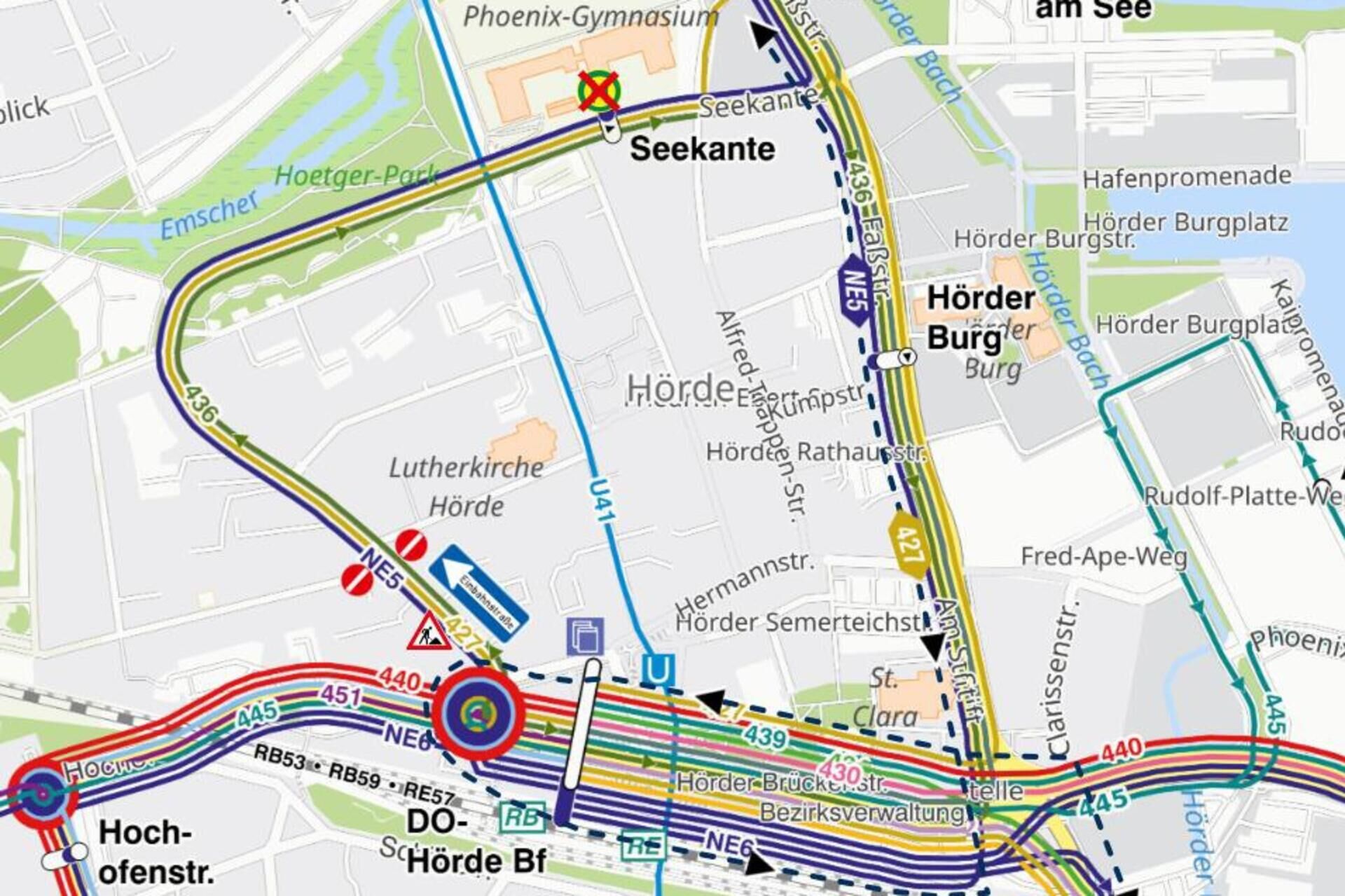 Die Haltestelle „Seekante“ entfällt deshalb. Als nächste Haltestellen werden „Hörder Hafenstraße“ und „Hörder Burg“ angefahren. Die Einschränkungen sollen laut DSW21 von Montag bis „voraussichtlich“ Dienstag (30.9.) gelten.