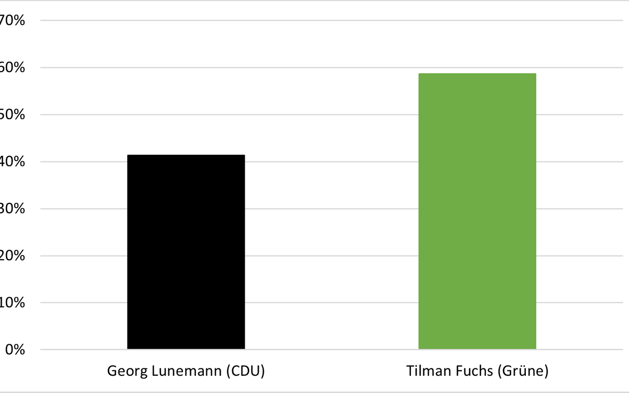 Im Gegensatz zur Wahl vor zwei Wochen funktioniert heute die Technik, so dass wir immer aktuell die Zwischenergebnisse abrufen können auf dieser Homepage. Es zeichnet sich etwa 58 % für Fuchs (Grüne) und 42 % für Dr. Lunemann (CDU) ab,