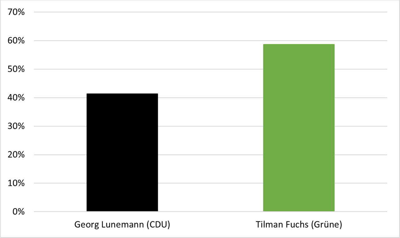 Im Gegensatz zur Wahl vor zwei Wochen funktioniert heute die Technik, so dass wir immer aktuell die Zwischenergebnisse abrufen können auf dieser Homepage. Es zeichnet sich etwa 58 % für Fuchs (Grüne) und 42 % für Dr. Lunemann (CDU) ab,