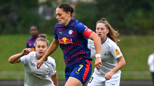 iDrei Tore, eine Vorlage: Mit ihrer Halbzeit-Bilanz konnte Leipzigs Nationalspielerin Giovanna Hoffmann (Mitte), hier bestaunt von den Andernacherinnen Leonie Wäschenbach (lnks) und Leonie Krump, zufrieden sein und sich zur Halbzeit auswechseln lassen. Am Ende siegte Ertstligist RB Leipzig beim Zweitligisten SG 99 Andernach im DFB-Pokalspiel mit 7:0. Norina Tönges