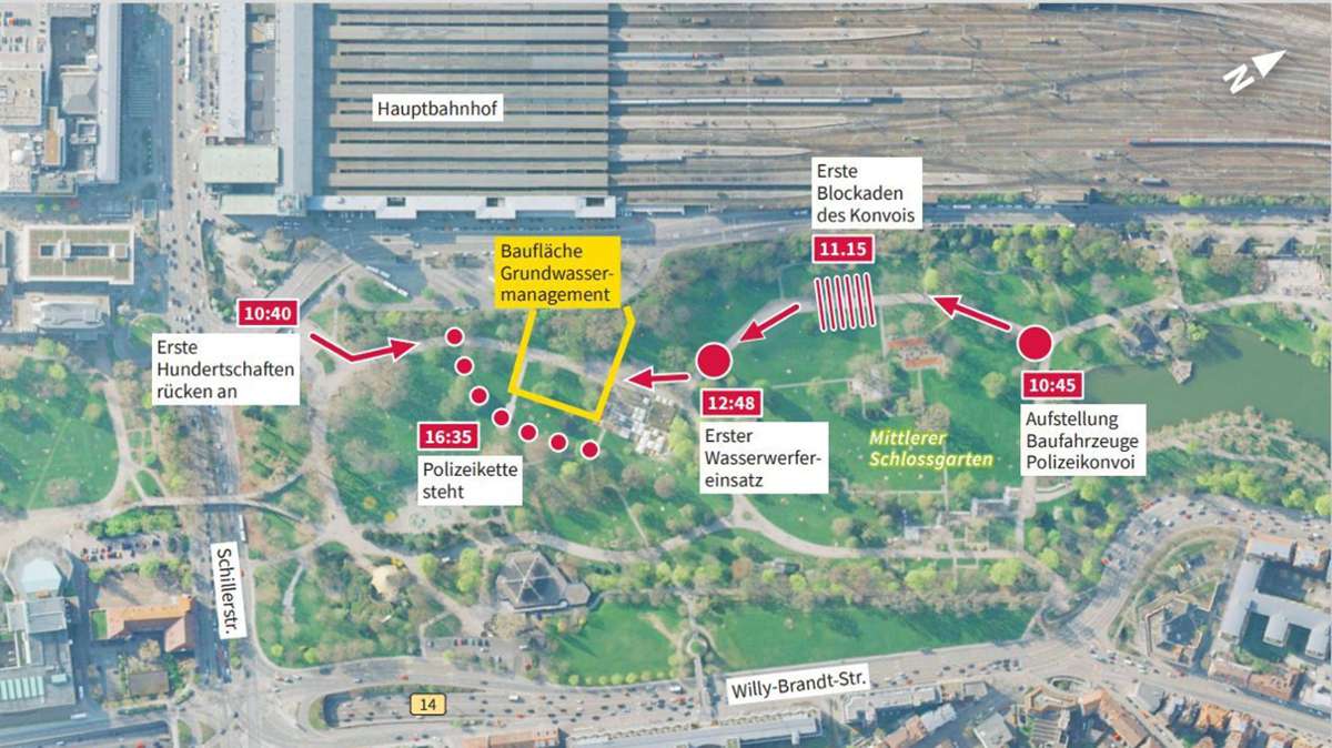 Tatort Schlossgarten 2010: Der erkämpfte Weg der Einsatzkräfte. Foto: Grafik Yann Lange