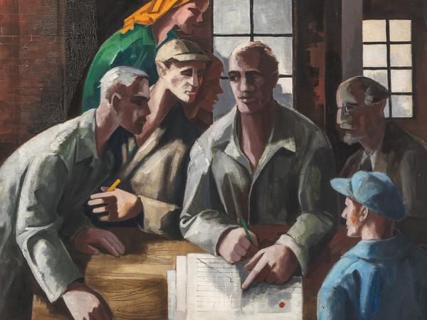 Wiederentdeckung auch in der Neuen Nationalgalerie: Horst Strempels Gemälde „Plandiskussion“ entstand 1949 und hängt aktuell in der Ausstellung „Zerreißprobe. Kunst zwischen Politik und Gesellschaft“ im Mies-van-der-Rohe-Bau.