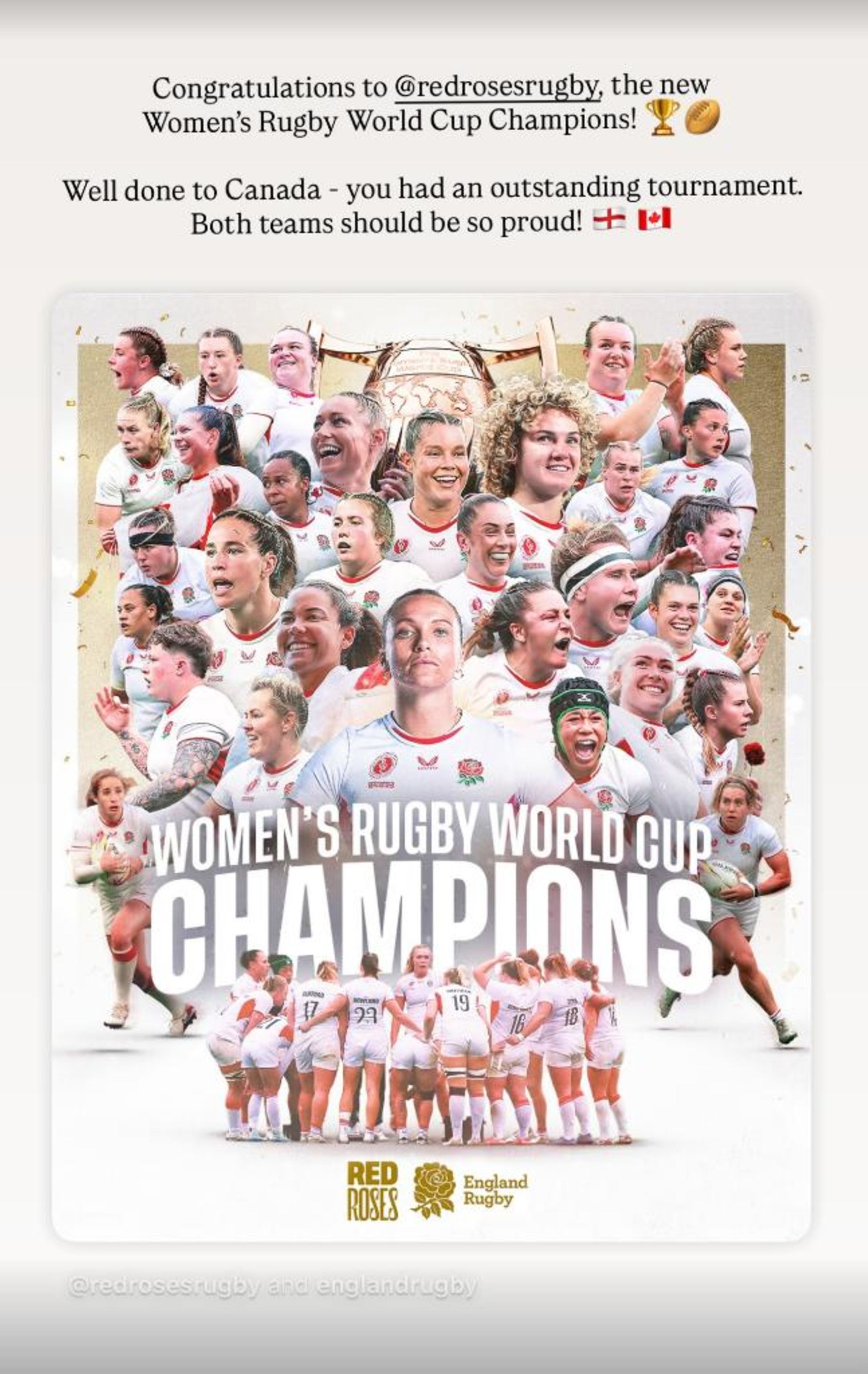 In der Story ihres offiziellen Instagram-Accounts postet sie ein Foto des Teams und schreibt: „Herzlichen Glückwunsch an @RedRosesRugby, die neuen Weltmeisterinnen im Frauen-Rugby! Gut gemacht, Kanada – ihr habt ein hervorragendes Turnier gespielt. Beide Teams können sehr stolz sein!“