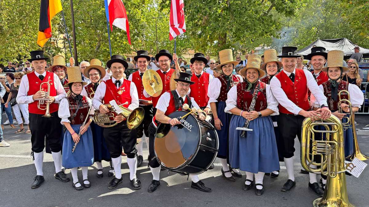 Für ein tolles Bild und sehr gute musikalische Unterhaltung sorgten die Musikerinnen und Musiker des Musikvereins Trachtenkapelle Nußbach unter Leitung von Simon Wiesenbach (Zweiter von rechts) beim Omelettefest in Fréjus. Foto: Stadt Triberg Austausch im Fréjuser Rathaus