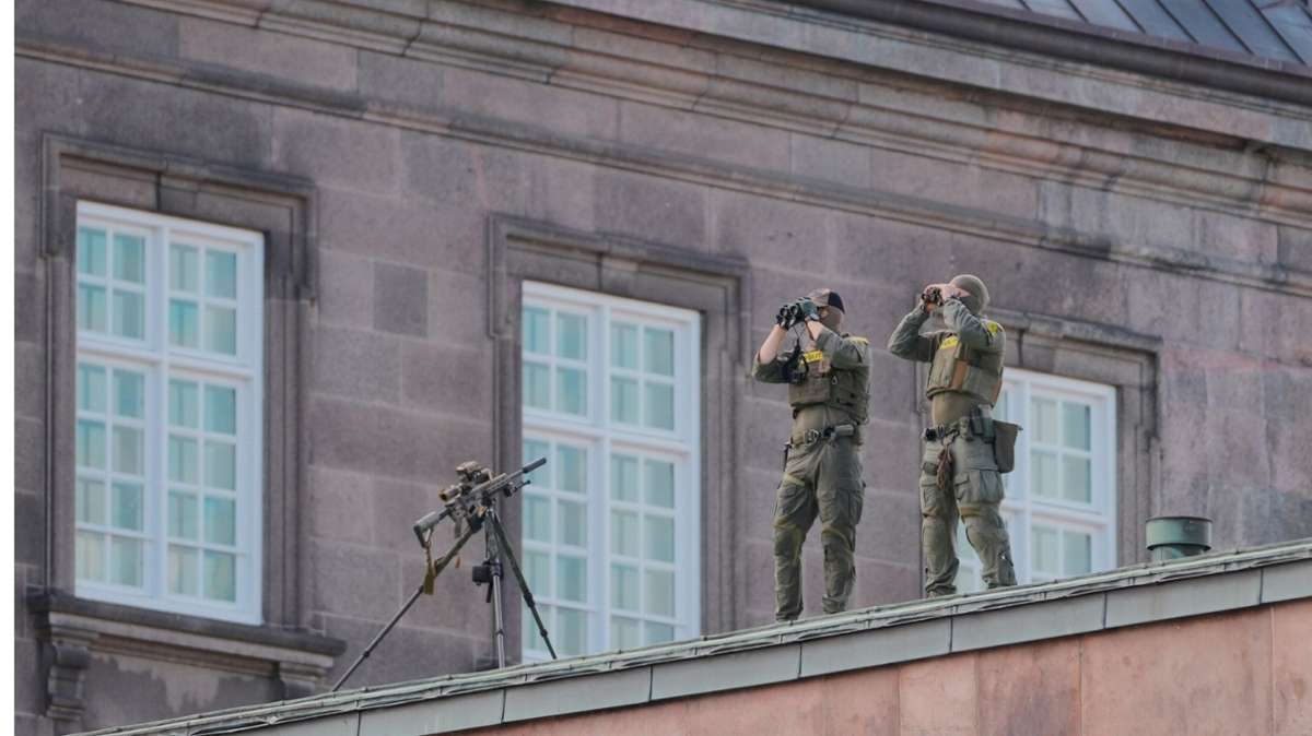 Scharfschützen stehen auf dem Dach, als die EU-Staats- und Regierungschefs zu einem informellen Gipfeltreffen im dänischen Parlament im Schloss Christiansborg in Kopenhagen eintreffen. Foto: dpa/AP/Emil Helms/Ritzau Scanpix