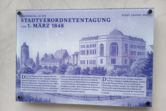 Eine Gedenktafel an der Leipziger Moritzbastei erinnert seit heute an die Leipziger Abgeordneten, die im Revolutionsjahr 1848 zusammengekommen waren und politische Reformen eingefordert hatten. Die Tafel wurde nach einem Entwurf des Leipziger Künstlers Kay Bachmann gestaltet. Enthüllt wurde sie bei einer Zeremonie am Nachmittag durch Kulturbürgermeisterin Skadi Jennicke (Die Linke) sowie die früheren Leipziger Stadträte Margitta Hollick und Christian Schulze.