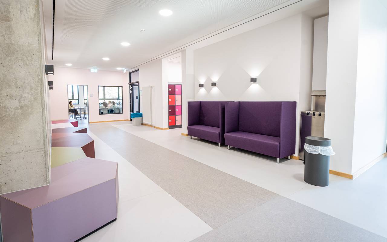 Die Stadt Dortmund hat einen großen Neubau eröffnet – die Schule verfügt jetzt über 5.500 Quadratmeter mehr Fläche. Das war nötig, weil es durch G9 und einen zusätzlichen Klassen-Zug mehr Schülerinnen und Schüler gibt. Im neuen Gebäude sind die zehnten Klassen und die Oberstufe untergebracht. Platz ist für bis zu 600 Schüler. Besonders praktisch ist, dass es auf jeder Etage offene Bereiche mit bequemen Sitzmöbeln gibt, in denen die Schüler zusammen lernen, sich austauschen oder einfach mal entspannen können. Technisch ist das Gebäude auf dem neuesten Stand – mit WLAN, smartem Licht, Fahrstuhl und einer umweltfreundlichen Lüftung. Rund 20 Millionen Euro hat die Stadt in den Neubau investiert.
