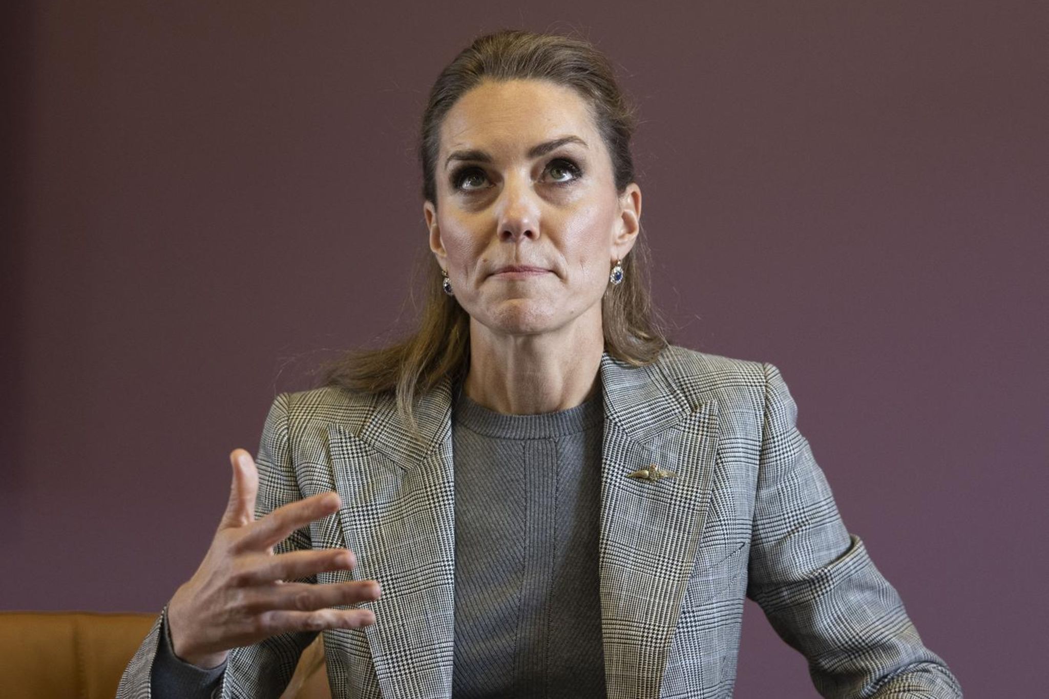 Obwohl Catherine keine militärische Ausbildung hat, verbindet sie mit dem neuen Amt mehr als gedacht. Ihr Großvater war ein RAF-Pilot. Sie weiß über die Wichtigkeit ihres Besuchs der Basis und dessen Strahlkraft Bescheid und nimmt sich selbst als Person an diesem Tag zurück. Bei ihrer Ankunft am Donnerstagnachmittag, 2. Oktober 2025, steigt sie mit einem grauen Anzug, einem grauen Pullover und schwarzen Veloursleder-Pumps aus dem Auto. Eine kluge Entscheidung, denn so lenkt sie weder mit Farben noch mit raffiniertem Design von dem Termin ab.