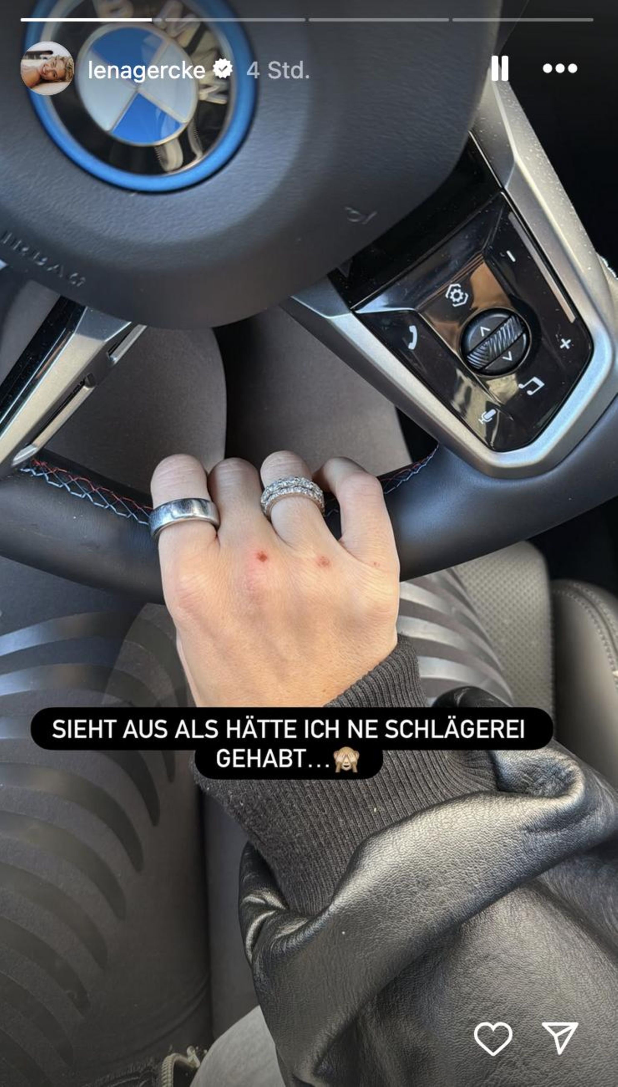 „Wisst ihr, was passiert ist?“, fragt Lena zunächst ihre 3,3 Millionen Instagram-Follwer:innen, um dann fortzuführen: „Ich bin nach meinem Zwei-Stunden-Schlaf in Paris morgens einfach ausm Auto gefallen.“ Dann lacht die erste GNTM-Gewinnerin von 2006 bemitleidenswert über sich selbst und ergänzt: „Ja, hat zum Glück keiner gesehen. War sehr elegant“. Einen Story-Slide zuvor zeigt Lena Gercke das Ergebnis ihres schlaftrunkenen Missgeschicks. „Sieht aus, als hätte ich eine Schlägerei gehabt“, schreibt sie und präsentiert die Verletzungen an ihrer rechten Hand.