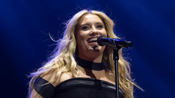 Eine Frau mit blonden langen Haaren in einem schwarzem Kleid singt in ein Mikrofon.