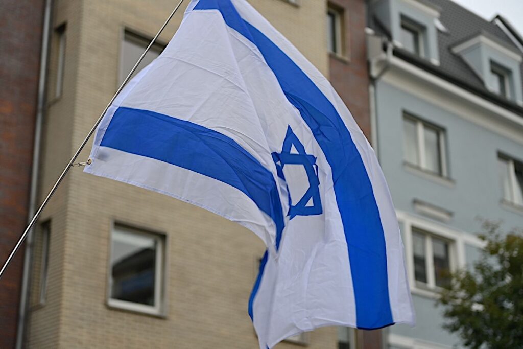 Die Teilnehmenden des Gedenkens hatten zahlreiche Israel-Flaggen mitgebracht.