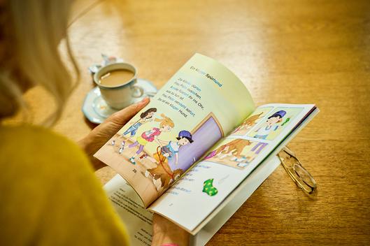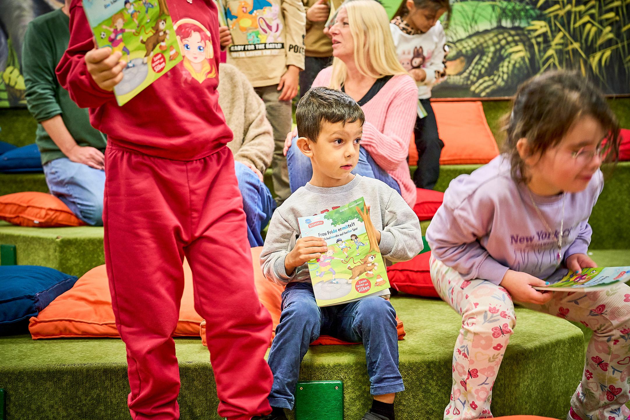 Zusammen mit Nils Janssen von der Buchhandlung Janssen und Susanne Grimmberg, Leiterin der Zentralbücherei, überreichte sie die Buchgeschenke an die Kinder. In diesem Jahr erhalten die Kinder das Erstlesebuch „Frau Frida ermittelt“ von Katja Alves. Die Buchhandlung Janssen unterstützt die Stadtbücherei bei der Auswahl und Besorgung des Buchgeschenks. Durch ihr Engagement ist es möglich, ein hochwertiges Kinderbuch zu einem günstigen Preis einzukaufen.