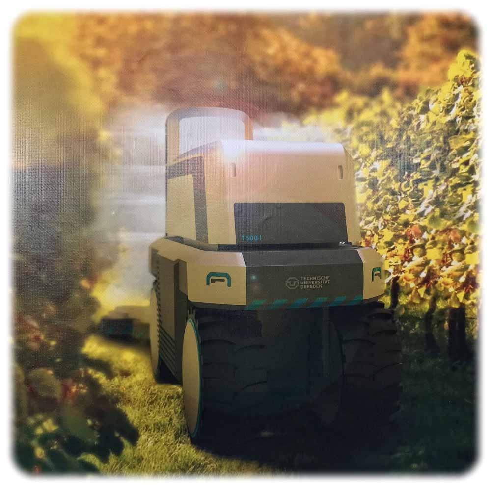 Der Elwobot aus Dresden soll helfen, Obst- und Weingärten zu besprühen und zu mulchen. Der Roboter ist extrem wendig und kann sich auch seitwärts bewegen. Die Visualisierung zeigt ihn mit möglichen Aufbauten. Visualisierung: TUD-Juniorprofessur für technisches Design