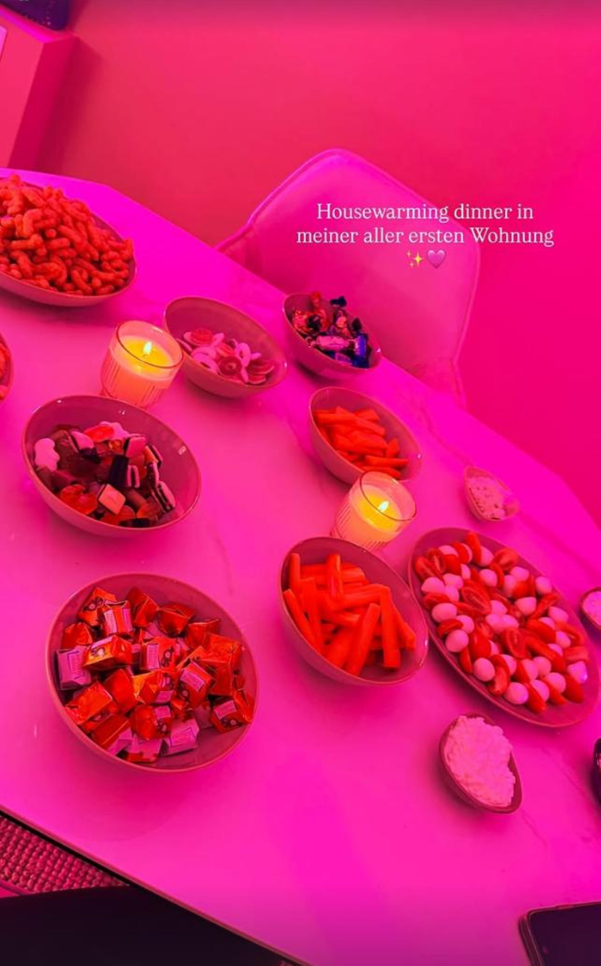 In ihrer Instagram-Story zeigt die 19-Jährige nun, dass sie endlich ihre erste Bleibe bezogen hat – und das wird natürlich angemessen gefeiert. Auf dem Schnappschuss ist zu sehen, dass die Sängerin den Tisch hergerichtet hat. Darauf sind allerlei Leckereien wie Chips, Schokolade sowie eine Platte mit Tomate und Mozzarella zu finden. Der Raum ist in pinkfarbenes Licht getaucht. „Einweihungsparty in meiner aller ersten Wohnung“, freut sich die Tochter von Marc Terenzi, 47.