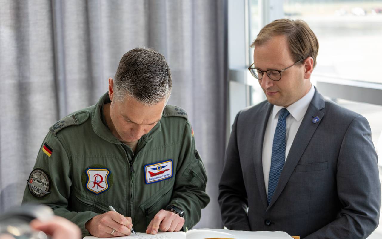 Als Zeichen der Verbundenheit mit der Bundeswehr hat der Bürgermeister von Greven, Dietrich Aden, Oberstleutnant Sebastian Fiedler stellvertretend für die Soldatinnen und Soldaten eingeladen, sich in das Goldene Buch der Stadt einzutragen.© FMO Flughafen Münster/Osnabrück GmbH