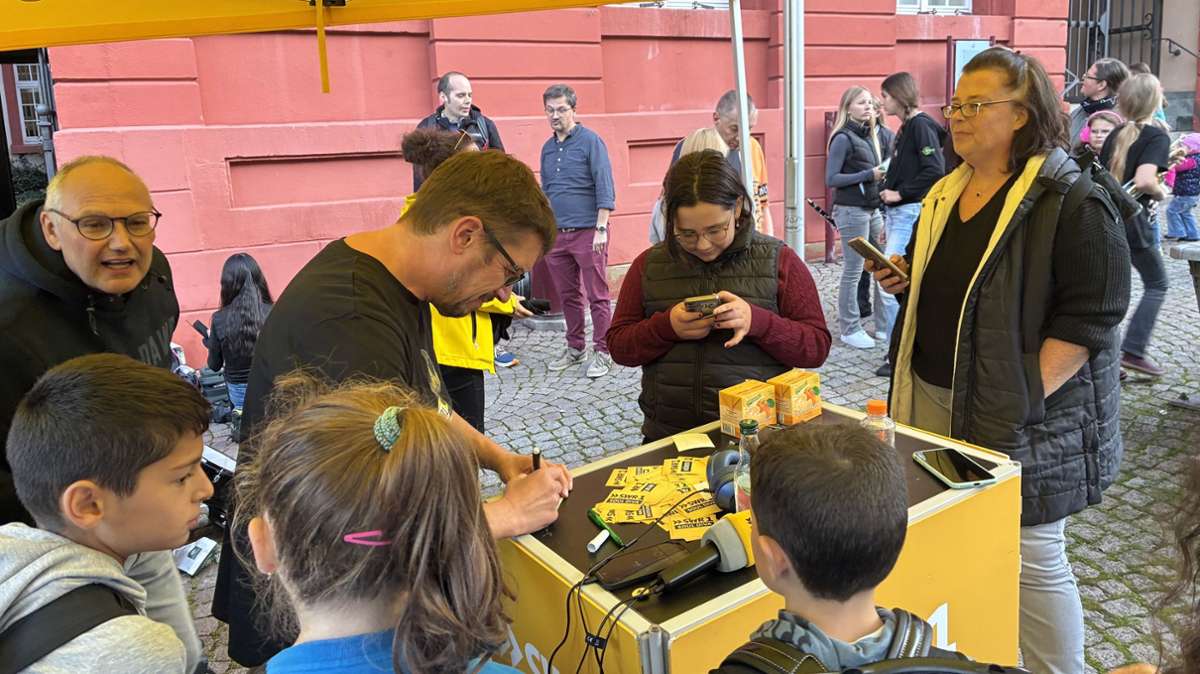 Ingo Lege verteilt Autogramme an die jungen Musiker. Foto: Raphael Sickinger