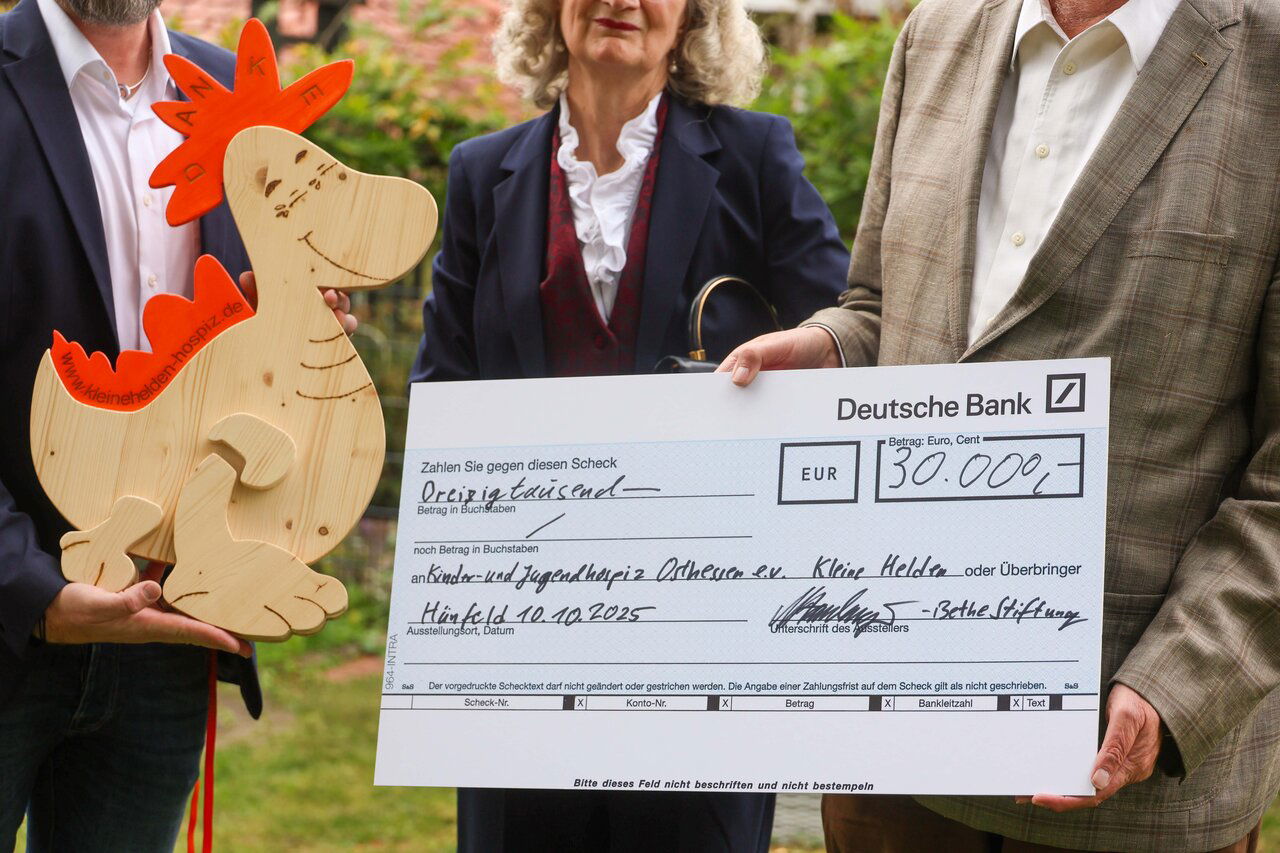 10.10.25 – Großer Erfolg für das Kinder- und Jugendhospiz Kleine Helden Osthessen e. V.: Die gemeinsam mit der Bethe-Stiftung durchgeführte Verdopplungsaktion ist abgeschlossen – mit starkem Ergebnis. Zwischen Dezember und Februar kamen 30.000 Euro an Spenden zusammen, die von der Stiftung verdoppelt wurden. Insgesamt stehen damit nun 60.000 Euro für den Bau des geplanten stationären Hospizes bereit – ein starkes Signal aus der Region und ein spürbarer Schritt in Richtung Realisierung des Herzensprojekts. Am Freitagnachmittag fand im Hünfelder Stadtteil Michelsrombach (Landkreis Fulda) die Checkübergabe statt.