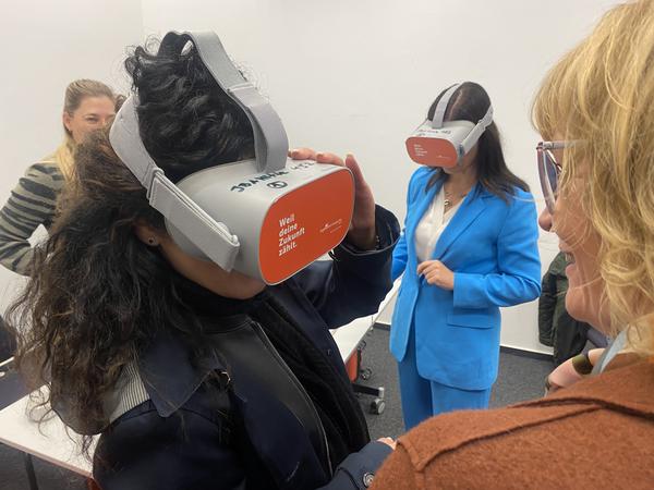Die Arbeitssenatorin Kiziltepe und Bildungssenatorin Günther-Wünsch schauen sich Ausbildungsberufe in der VR-Brille an.