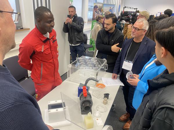 Zwei Angebote hat Ingo Kraatz von der Firma Polywerk im Gepäck. Er steht mit seinem Mitarbeiter Hafiz Taibou an einem Tisch voller Kunststoffteile. Hafiz kam 2016 aus Benin in Westafrika nach Berlin, machte hier seine Ausbildung zum Kunststofftischler, wurde übernommen. „Viele kennen den Beruf einfach nicht“, sagt Kraatz. „Darum sind wir hier.“