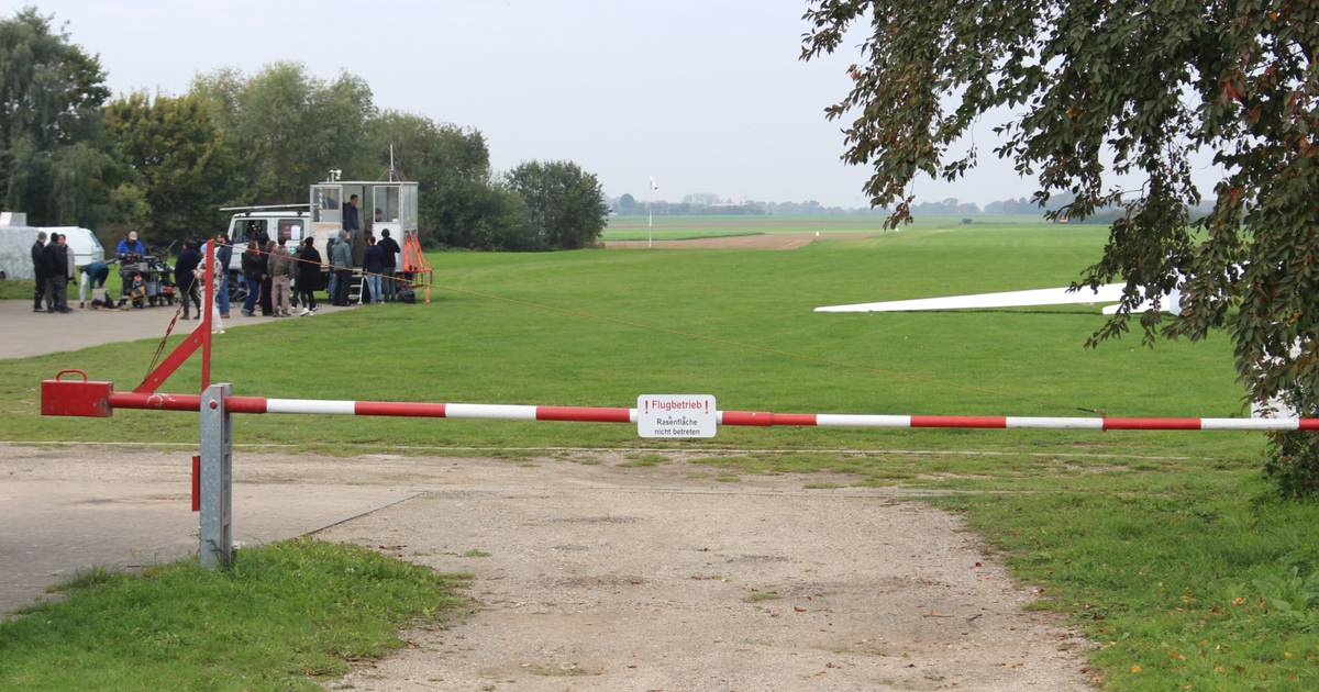 Ein Segelflugzeug wird von einem Auto mit Kamera-Equipment auf dem Dach über eine Grünfläche gezogen. Daneben steht ein kleines Häuschen auf einem Fahrzeug, von dem aus Menschen die Dreharbeiten beobachten. Über das Gelände des Segelflugplatzes Wanlo sind Crewmitglieder verstreut. Freitag, 10. Oktober, ist der letzte von drei aufeinanderfolgenden Drehtagen für den Tatort Münster im WDR.