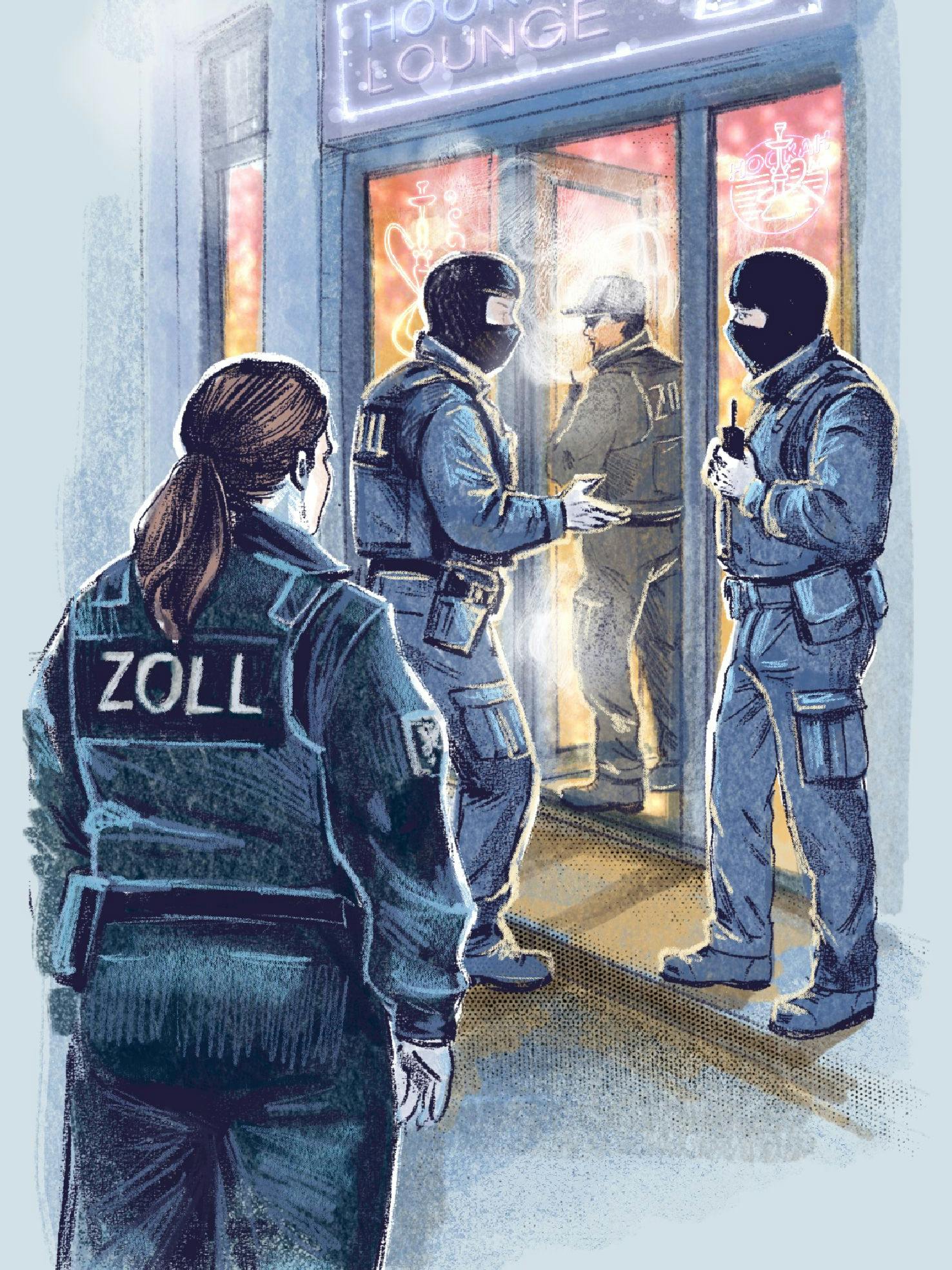 Bei diesem sogenannten Verbundeinsatz stehen 50 Läden auf dem Zettel: auch Shishabars und Läden für Shishazubehör. Mit quietschenden Reifen halten drei Polizeiautos vor einem Shishazubehörgeschäft in Friedrichshain. Keiner der beiden Männer, die hinter dem Ladentresen stehen, darf raus, kein Kunde darf rein. Vor der Tür postieren sich drei Polizeibeamte. Die Verkäufer müssen dem Mann vom Finanzamt die Kassenaufzeichnungen geben. Währenddessen durchstöbern Zöllner die Regale nach Tabakbüchsen, auf denen die Steuerbanderole fehlt.